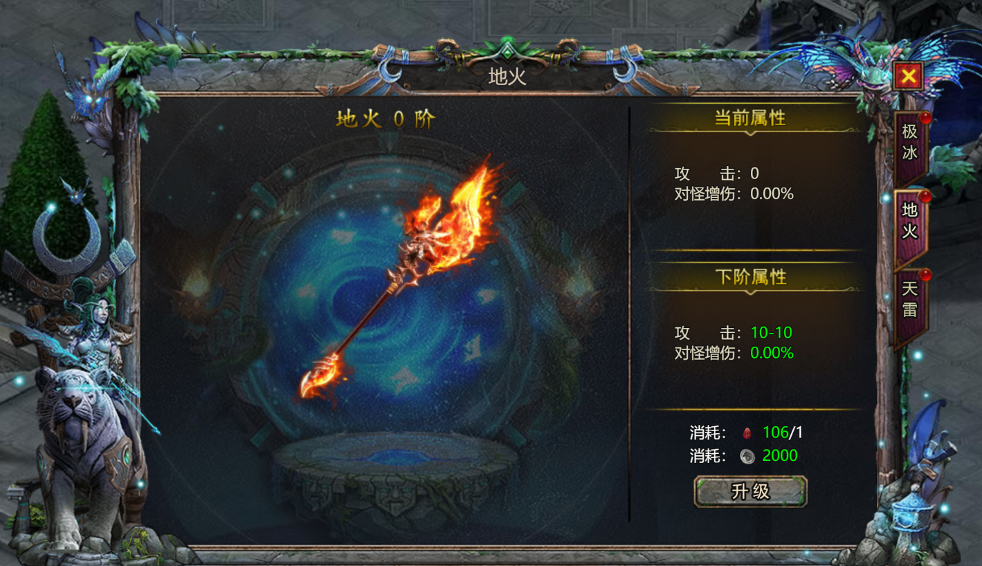 分别极冰、地火、天雷法杖,极冰主打攻击受怪减免,地火主打对怪增伤,天雷生命加成,主打前期优先升级,挂机打BOSS轻松无压力。体验。