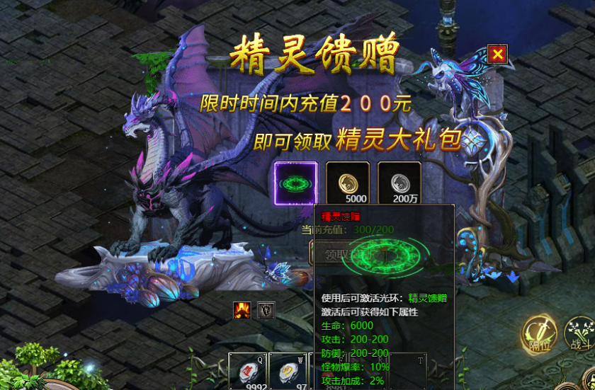 •累计充值200元:5000金币、精灵馈赠光环、200w银币